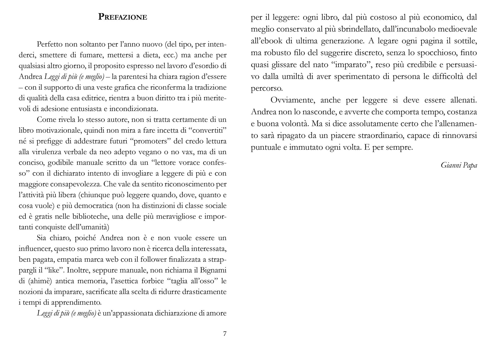 Questo non è certamente un libro motivazionale, quindi non mira a fare incetta di “convertiti” né si prefigge di addestrare futuri “promoters” del credo lettura alla virulenza verbale da neo adepto vegano o no vax, ma di un conciso, godibile manuale scritto da un “lettore vorace confesso” con il dichiarato intento di invogliare a leggere di più e con maggiore consapevolezza. Leggi di più (e meglio) è un’appassionata dichiarazione di amore per il leggere: ogni libro, dal più costoso al più economico, dal meglio conservato al più sbrindellato, dall’incunabolo medioevale all’ebook di ultima generazione. A legare ogni pagina il sottile, ma robusto filo del suggerire discreto, senza lo spocchioso, finto quasi glissare del nato “imparato”, reso più credibile e persuasivo dalla umiltà di aver sperimentato di persona le difficoltà del percorso. Ovviamente, anche per leggere si deve essere allenati. Andrea non lo nasconde e avverte che comporta tempo, costanza e buona volontà. Ma si dice assolutamente certo che l’allenamento sarà ripagato da un piacere straordinario, capace di rinnovarsi puntuale e immutato ogni volta. E per sempre. (dalla prefazione)