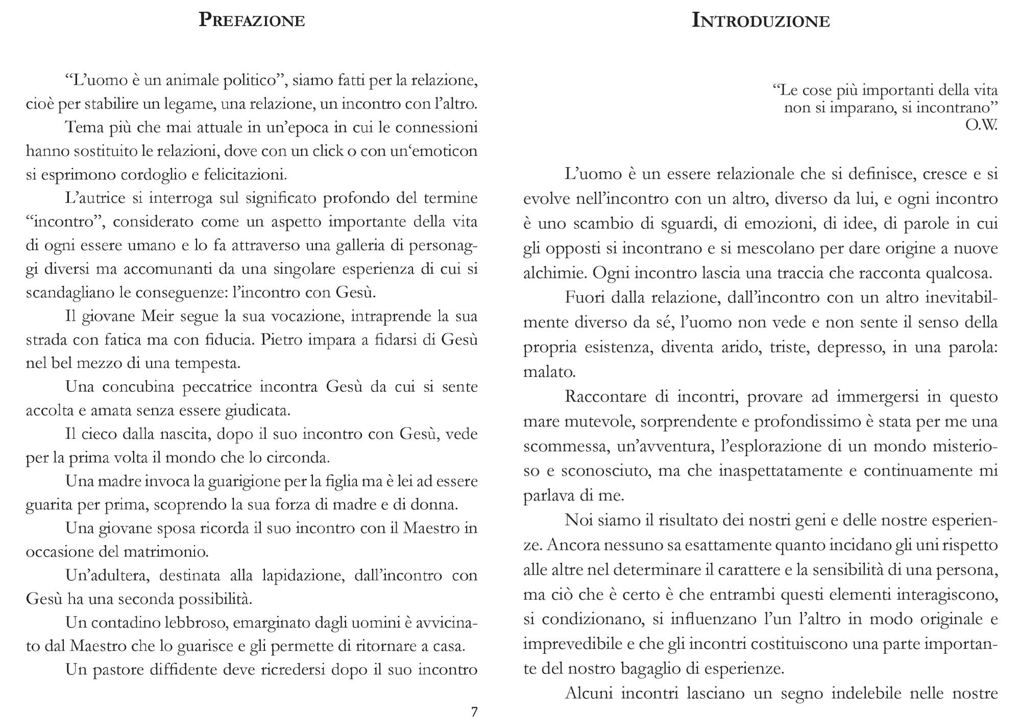 “L’uomo è un animale politico”, siamo fatti per la relazione, cioè per stabilire un legame, una relazione, un incontro con l’altro. Tema più che mai attuale in un’epoca in cui le connessioni hanno sostituito le relazioni, dove con un click o con un‘emoticon si esprimono cordoglio e felicitazioni. L’autrice si interroga sul significato profondo del termine “incontro”, considerato come un aspetto importante della vita di ogni essere umano e lo fa attraverso una galleria di personaggi diversi ma accomunanti da una singolare esperienza di cui si scandagliano le conseguenze: l’incontro con Gesù. Il giovane Meir segue la sua vocazione. Pietro impara a fidarsi di Gesù nel bel mezzo di una tempesta. Una concubina peccatrice incontra Gesù da cui si sente accolta e amata senza essere giudicata. Il cieco dalla nascita, dopo il suo incontro con Gesù, vede per la prima volta il mondo che lo circonda. Una madre invoca la guarigione per la figlia ma è lei ad essere guarita per prima, scoprendo la sua forza di madre e di donna. Una giovane sposa ricorda il suo incontro con il Maestro. Un’adultera, destinata alla lapidazione, dall’incontro con Gesù ha una seconda possibilità. Un contadino lebbroso è avvicinato dal Maestro che lo guarisce e gli permette di ritornare a casa. Un pastore diffidente deve ricredersi dopo il suo incontro nella stalla di Betlemme. Il pubblicano Zaccheo ha l’onore di ospitare a casa sua il Maestro. Sono tutti personaggi che grazie all’Incontro con Gesù hanno scoperto il senso della loro esistenza e trovato la loro strada, un percorso che ogni lettore può compiere.