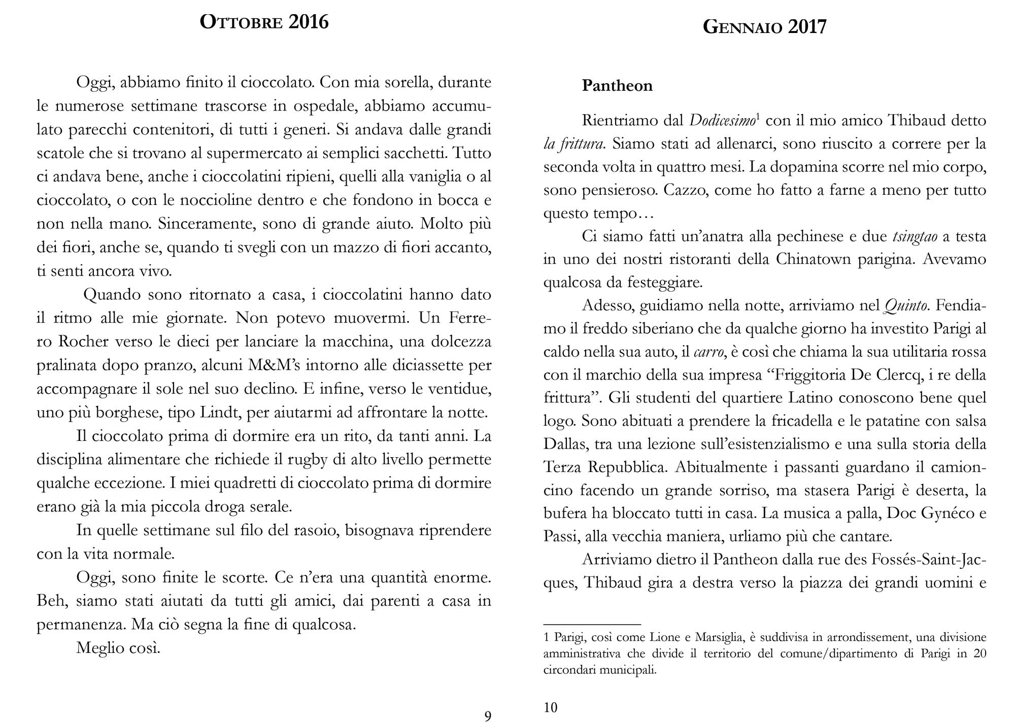 Il 13 novembre 2015 Parigi fu scossa da una serie di attentati, il più famoso fu quello al Bataclan. Tra i feriti anche Aristide Barraud. Si trovava al ristorante “Le Petit Cambodge”, con gli amici e la sorella. All’epoca ha ventisei anni e da poco si è trasferito in Italia per giocare a rugby. In precedenza aveva vestito le maglie del Massy e dello Stade Français, una della più importanti squadre francesi, dove però aveva trovato poco spazio. Così, nel 2013, accetta l’offerta del Lyons Piacenza e viene a giocare nel nostro campionato di serie A. Si mette subito in evidenza e l’anno successivo viene chiamato dal Mogliano, squadra che disputa il Top 12, e ne diventa uno dei giocatori più importanti. Ma poi arriva quel maledetto 13 novembre e, nel tentativo di proteggere la sorella (che ne uscirà “soltanto” con una ferita al braccio), si ritrova con le costole fratturate, un polmone perforato e una caviglia sbriciolata. Le sue condizioni sono disperate ma lui tiene duro, viene operato, e si riprende. Al punto che, sei mesi dopo il ferimento, ritorna a Mogliano per ricominciare gli allenamenti. Ma il rugby è uno sport duro e il suo fisico non riesce più a reggere gli scontri di gioco. È l’addio allo sport tanto amato. Qui racconta la sua storia affrontando il cambiamento. Un lento processo che coinvolge svariati aspetti della sua esistenza e che prende nuova forma giorno dopo giorno. Questo è un libro che fa riflettere sotto tanti punti di vista e che fornisce interessanti spunti di rinnovata speranza.