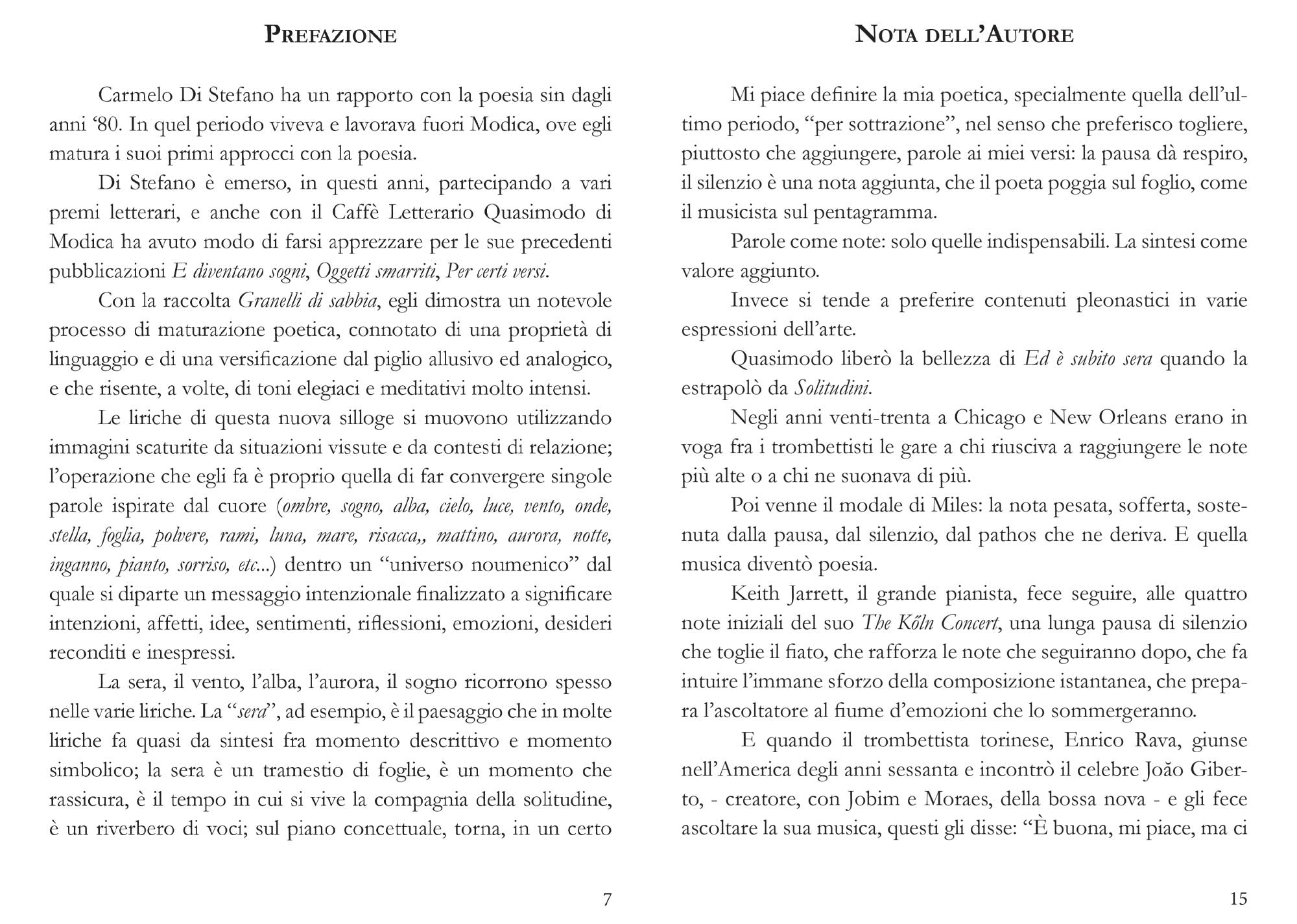 Mi piace definire la mia poetica “per sottrazione”. La pausa dà respiro e il silenzio è una nota aggiunta che il poeta poggia sul foglio, come il musicista sul pentagramma. Granelli di sabbia è  una tappa importante della mia produzione poetica, il momento della consapevolezza, dell’autocritica, della riflessione, dello stupore. Perché questo titolo e il continuo riferimento alla  clessidra? La clessidra è per me metafora della vita, i granelli siamo noi che ci sfioriamo eppure siamo distanti, ci tocchiamo e ci ignoriamo, apatici, indifferenti; la sabbia sono gli istanti che ci sfuggono, quel tempo che ci illudiamo di saper gestire, per poi accorgerci di averlo perso solo quando non c’è più tempo per recuperarlo. Clessidre che si frantumano e sabbia che si  disperde, i nostri momenti che si perdono senza che noi li si possa afferrare. Rincorse affannose e ormai inutili. Granelli di sabbia: sogni e rimpianti; passioni ed emozioni; esperienze,  delusioni e affetti; tutti momenti dispersi dal vento impetuoso e impietoso che è la nostra vita.