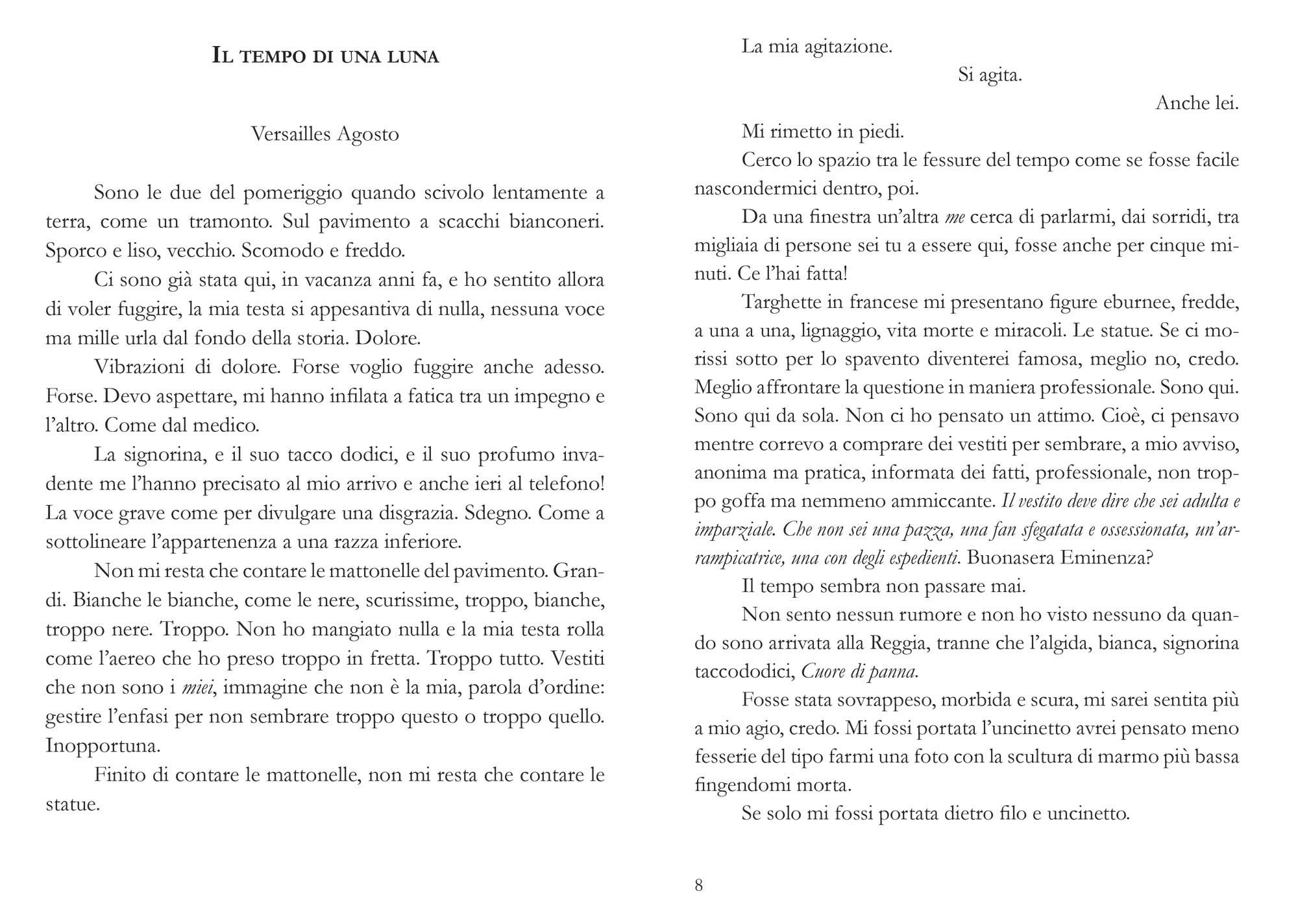 Bruna è felice, verace, sensitiva. Innamorata dei ricordi delle sue nonne, della sua isola e di Guenda, la sua cagnolina. Affascinata da numeri e magia. Ha un sogno, una missione, un segreto e il dono di poter modificare il corso degli eventi, riscrivendoli. Ha una casa con un cortile in Sicilia da dove guarda e ama la Luna, e nel tempo di una Luna si scrive la sua avventura a Versailles e la relazione complicata con Noah, un uomo bellissimo, incoerente e pericoloso, con tante maschere e una vita piena di ombre. C’è qualcosa che viene dal passato, nel tempo di un’altra Luna, che pende sulla testa dei due come una maledizione, qualcosa che Diego non perdonerà mai. La sua vendetta è articolata e feroce. Diego vuole Noah per distruggerlo.
