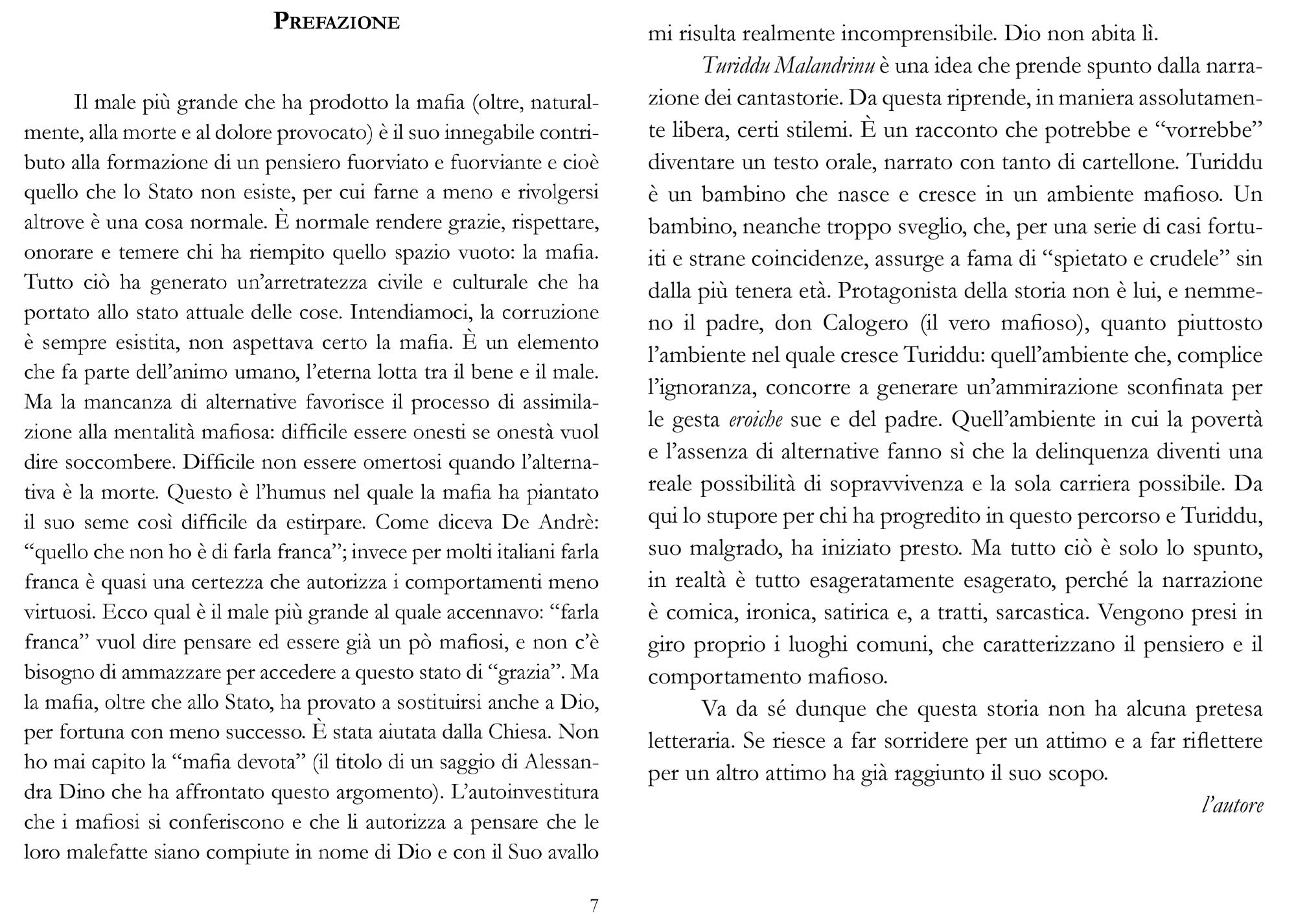 Turiddu è un bambino che nasce e cresce in un ambiente mafioso. Un bambino, neanche troppo sveglio, che, per una serie di casi fortuiti e strane coincidenze, assurge a fama di “spietato e crudele” sin dalla più tenera età. Protagonista della storia non è lui, e nemmeno il padre, don Calogero (il vero mafioso), quanto piuttosto l’ambiente nel quale Turiddu cresce: quell’ambiente che, complice l’ignoranza, concorre a generare un’ammirazione sconfinata per le gesta eroiche sue e del padre. Quell’ambiente in cui la povertà e l’assenza di alternative fanno sì che la delinquenza diventi una reale possibilità di sopravvivenza e la sola carriera possibile. Da qui lo stupore per chi ha progredito in questo percorso e Turiddu, suo malgrado, ha iniziato presto. Ma tutto ciò è solo lo spunto, in realtà è tutto esageratamente esagerato, perché la narrazione è comica, ironica, satirica e, a tratti, sarcastica. Vengono presi in giro proprio i luoghi comuni, che caratterizzano il pensiero e il comportamento mafioso. Questo libro, se riesce a far sorridere per un attimo e a far riflettere per un altro attimo ha già raggiunto il suo scopo.