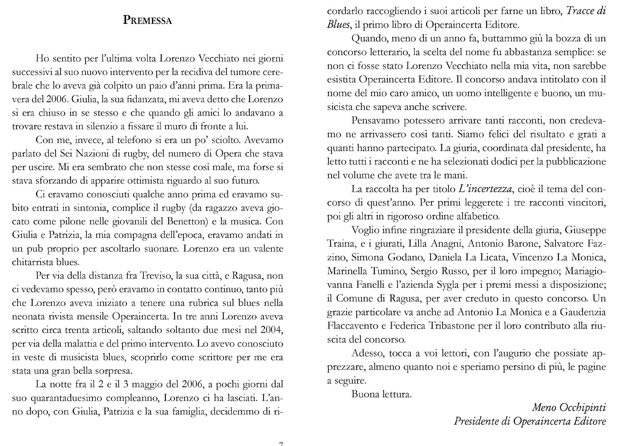 Il concorso letterario “Lorenzo Vecchiato – Città di Ragusa”, e questo volume che raccoglie i dodici migliori racconti pervenuti, vogliono essere un piccolo ricordo di un caro amico, un uomo intelligente e buono, un musicista che sapeva anche scrivere e che ci ha lasciati troppo presto.