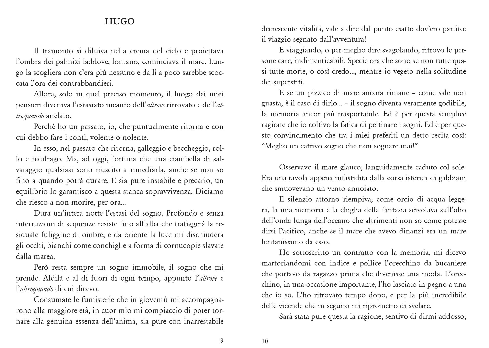 Il nostromo di nome Hugo – l’acca davanti e l’accento sulla o, pronuncia alla francese – è il protagonista e per larghi tratti l’io-narrante di questo romanzo. Oramai immobilizzato su una sedia a rotelle a causa di un incidente sul lavoro che ne ha paralizzato le gambe ma non intaccato la memoria, Hugo vegeta gli ultimi anni della sua tormentata esistenza nella locanda Vita Eterna!, la casa di cura dove si trova in perfetta solitudine. Qui, tra terapia e riabilitazione, trova il tempo, tra sogno e realtà, di rivivere i fatti salienti che hanno segnato il suo quasi mezzo secolo di vita, specie in relazione alle vicende legate alle persone incontrate, lasciate e ritrovate, e che l’hanno profondamente segnato nell’animo. Così, in un caleidoscopio sempre mutante di fatti e situazioni, di scenari e linguaggi, di ambientazioni e personaggi, emergono dallo scrigno della memoria Misia, la madre; Matis/Esmeralda, la sorellastra; Libero, il padre; Mazzino, il nonno; Soledad, la figlia naturale; Isolina, la ragazza da marciapiede di cui si innamora. Personaggi che l’autore tratteggia non solo negli aspetti fisiognomici ma ancor prima e meglio nelle passioni e nei sentimenti con un linguaggio letterario effervescente e schietto, sempre sospeso tra rappresentazione onirica e realtà, tra immaginazione e concretezza. Dentro le vicissitudini esistenziali il protagonista ci appare un eroe del nostro tempo, fragile e instabile analogamente all’epoca con cui ha crudelmente convissuto, anni e vicende con cui ognuno di noi è costretto a fare i conti.