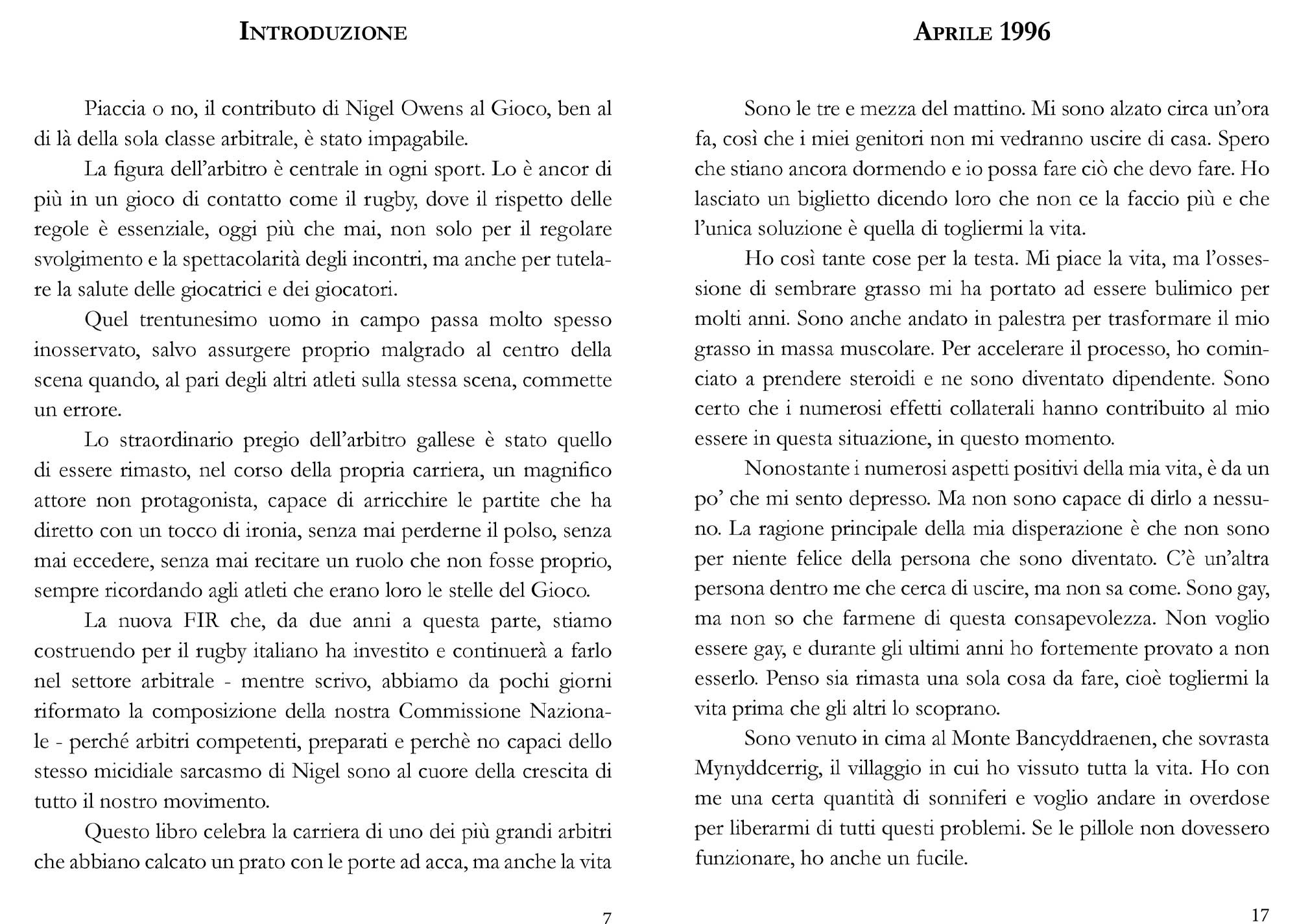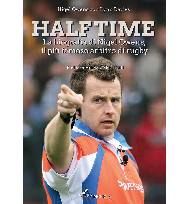 nei momenti importanti della sua carriera: la sua prima partita internazionale è stata London Irish-Lyons Piacenza nel 2001 (Challenge Cup). La prima nell’Heineken Cup: Calvisano-Perpignan (2002). La prima partita nel Sei Nazioni: Inghilterra-Italia (2007). Il centesimo e ultimo test-match: Francia-Italia (2020) Arbitro con il record di partite arbitrate (100 test-match), testimonial della comunità Lgbt e contro il bullismo, del quale anche è stato vittima, comico, doppiatore, cantante, allevatore, conduttore radiofonico e televisivo, editorialista, difensore del Cymraeg. Gay dichiarato, ha fatto coming out nel 2007, la biografia inizia con il suo proposito di suicidio proprio per sfuggire alla pressione della sua condizione. Per fortuna, sua e nostra, non è riuscito nel suo intento, è stato trovato in tempo. “Non accettavo – scrive – chi e cosa ero, ma non permetterò più a me stesso di raggiungere un tale stato”. Noi italiani amanti del mondo ovale abbiamo inizialmente conosciuto solo una piccola parte di Nigel Owens, quando già era entrato nel club degli arbitri internazionali, non sapendo che dietro le sue memorabili battute con i giocatori (da “Il campo da calcio è 500 metri più in là” a “Non credo che ci siamo mai incontrati prima, ma io sono l’arbitro”) c’era un complesso e avventuroso cammino che lascia a bocca spalancata e che merita di essere ripercorso passo dopo passo grazie a questa sua autobiografia. “Devo più io al rugby di quanto il rugby mi dovrà mai” è il tweet digitato subito dopo il suo ultimo test-match internazionale. Un saluto alla Nigel Owens.