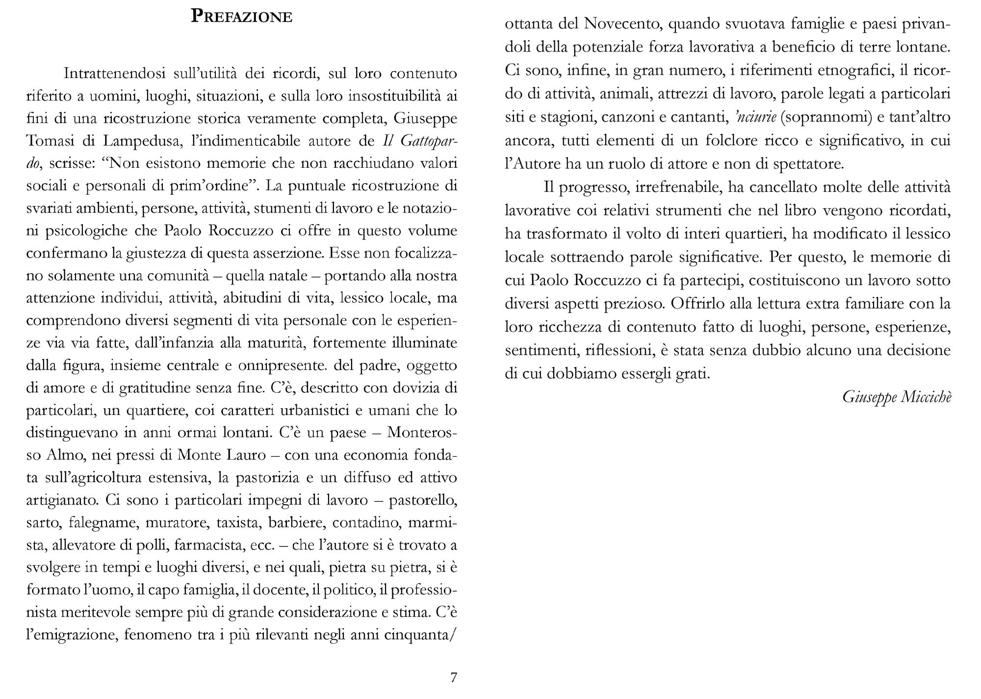 Gli avi ripetevano: “Impara l’arte e mettila da parte, prima o poi ti tornerà utile”. Questo è sicuramente vero, ma penso si riferissero principalmente alla possibilità di svolgere un lavoro quando il tuo non trovava un mercato, quindi alla possibilità di avere nella vita un’alternativa. Avere svolto tanti mestieri è come conoscere tante lingue, ti mette nelle condizioni di comunicare e confrontarti con persone con le quali in apparenza non hai nulla in comune. Questo libro è nato per caso e per una serie di coincidenze favorevoli e non è il frutto di una romantica nostalgia, ma di una meditata riflessione e dell’esperienza vissuta allora come bambino ed ora come osservatore attento delle abitudini quasi imposte dalla società consumistica. Le storie che vi sono raccontate hanno lo scopo di lasciare un minimo di impressione su un mondo reale che ho vissuto e che oggi non viene percepito come tale, lasciare quindi qualcosa di me stesso attraverso sensazioni e sentimenti vissuti. In poche parole lasciare le mie radici. Spesso penso a cose di anni fa, a quando chiedevo a mio padre o a mia madre informazioni su qualcosa che non avevo approfondito sufficientemente. Mi ritrovo, oggi, però a darmi da solo una risposta sconsolata. Non posso oramai chiedere a nessuno, perché i miei genitori non ci sono più. Considero questo un grande limite, una perdita immensa. Ecco perché racconto con ancora più entusiasmo le mie storie, la storia della mia famiglia e del mio mondo.