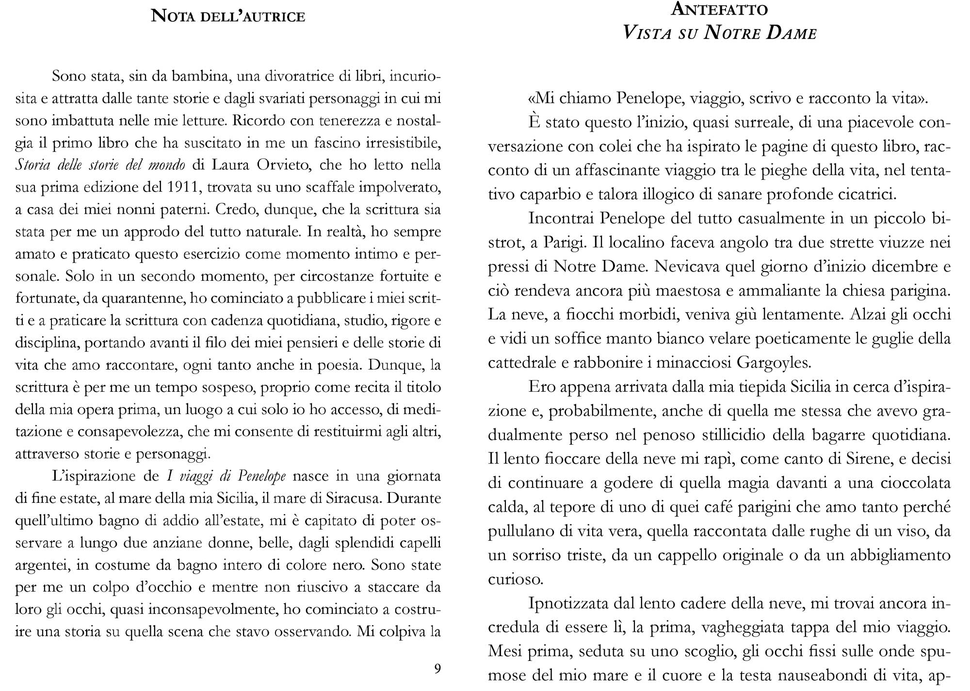Penelope tesse la sua tela ponendo dinanzi a sé anime pure e prive di orientamento o di consapevolezza: sono gli specchi delle tante sfaccettature della sua stessa essenza. Sullo sfondo c’è una realtà variegata che ha il sapore e i colori delle vetrate gotiche delle chiese parigine, delle spezie d’Oriente, dello tzatziki e le amare tinte della realtà newyorkese. Una mescolanza di tradizioni, usanze, ricette culinarie appartenenti ai luoghi descritti che immerge il lettore in un viaggio dell’anima che porterà alla consapevolezza dell’eterogeneità, laddove il diverso costituisce la giustapposizione di una sfumatura di colore. Penelope e le sue amiche sono i diversi aspetti della femminilità; i tetti di Parigi, i terrazzini sul Partenone coincidono con la realtà vista dall’alto, sano approdo alla ricerca di se stessi e della verità. La storia antica si intreccia con le pagine più dolenti della storia contemporanea facendo riecheggiare e sentire vivo il sempre valido insegnamento dell’historia magistra vitae.